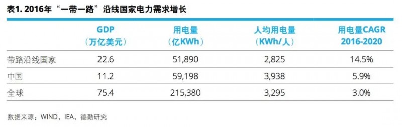 带路沿线国家电力需求持续高速增长。“一带一路”目前覆盖国家总人口46亿,人均用电量约为2,825千瓦时,远低于国际水平的3,295千瓦时1。未来带路沿线国家的电力需求会保持高速增长,2016年带路沿线国家发电量约为51,890亿千瓦时,2020年预测发电量将比2016年增长70%。