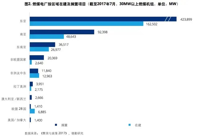 首先,大量煤电项目被搁置。2017年1月与2016年同期相比,全球开工前及规划中燃煤电厂装机下降48%,在建项目装机下降19%,而搁置项目为同期的164%(图1)。截至2017年7月,全球30MW以上煤电项目有6亿千瓦装机被搁置,占煤电总装机规划的42%。在东亚,4.2亿千瓦煤电装机被搁置,中国和日本限制燃煤电厂为主要原因。中国企业煤电海外投资的主要地区,如南亚和东南亚也有大量项目被搁置目录(图2)。碳约束、融资缺口、投资环境、水资源压力都成为燃煤电站搁置的原因。
