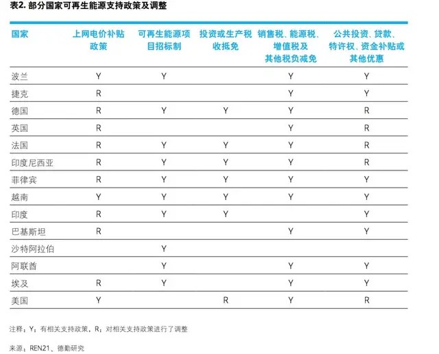 除了上网电价规定,很多国家对支持可再生项目的财税政策和其他相关配套政策进行调整。伊朗规定太阳能和风能发电厂35%的国产化率,土耳其规定如果所有风机都由本国生产则可享受50%的电价提升,而进口太阳能面板发电价格则要减半。