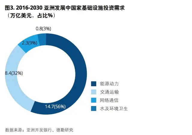 据亚洲开发银行2017年预测,从2016年到2030年,亚洲发展中国家的基础设施建设投资需求总额达到26万亿美元,其中14.7万亿美元(占比56%)为能源动力投资需求(图3)。按照这个预测,亚洲国家每年均基础设施投资需求为1.7万亿,远远高于现在近9,000亿美元的投资水平。8