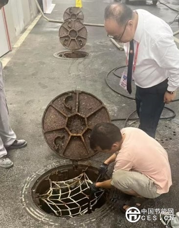 (图为赖国良正在排查排水系统问题,右一为赖国良)