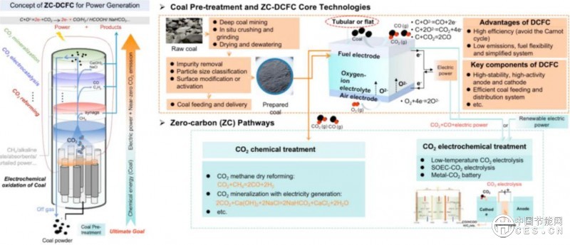 近零碳排放直接煤燃料电池发电技术即煤炭不通过燃烧,通过氧化膜实现电化学氧化,直接转换成电能,同时在系统内二氧化碳直接催化、转化、矿化、电化等,实现近零碳排放发电利用并产生高价值产物。