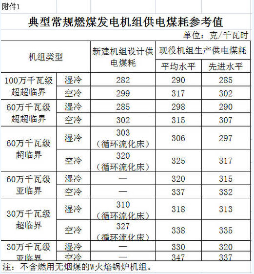 100万千瓦、60万千瓦级湿冷机组,设计供电标煤耗分别不高于282、285克/千瓦时;30万千瓦、60万千瓦级循环流化床低热值煤湿冷机组,设计供电煤耗分别不高于310、303克/千瓦时。