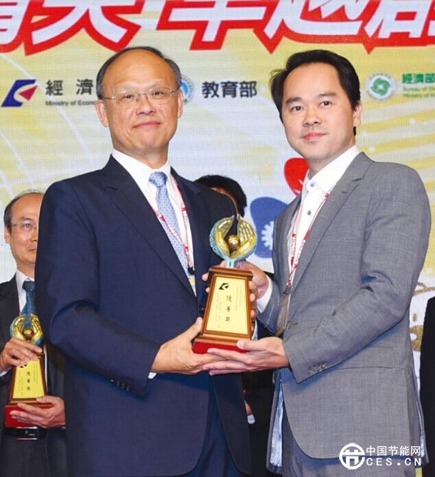 大康织机公司协理赵国华(右)接受经济部长邓振中(左)颁发节能优等奖奖座。图/业者提供