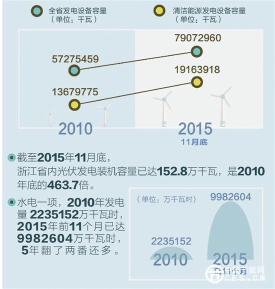 截至2015年11月底,浙江清洁能源发电设备容量为1916.39万千瓦,占全省发电装机容量的24.24%,比2010年底增长40%。单单水电一项,2010年发电量为2235152万千瓦时,2015年前11个月已达9982604万千瓦时,5年翻了两番还多。省内光伏发电装机容量已达152.8万千瓦,是2010年底的463.7倍。