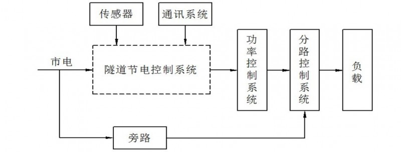 隧道照明节电系统主要包括:隧道照明控制器、车辆传感器、光强传感器、功率控制系统、分路控制系统、旁路系统、通讯系统。隧道照明节电系统图如下图所示。由于多数隧道在夜间几乎没有车通过,所以在夜间长时间无车通过时,隧道照明节电系统切断照明负载电源,有车时接通供电电源,照明灯具在车辆进入隧道之前启动并进入正常照明状态,在夜间或白天短时间无车辆通过时,隧道照明节电系统自动调整输入功率,降低照明负载的照明照度,在车辆进入隧道之前恢复正常供电功率,使照明灯具在车到来之前恢复正常照明状态,为司机提供合适的光线。当检测汽车驶出隧道后,延时关闭隧道灯光或降低照明照度,实现节约电能。在车流量不大的情况下,当检测没有车辆进入隧道时,根据光强传感器所检测到的隧道内外光强差值,在隧道内只开启相应的基本照明,当车辆检测器检测到车辆将进入隧道时,开启隧道洞口的加强照明,当车辆进入隧道后,则将车辆前面一段相应距离的加强照明开启,一旦后面无车辆跟进,则将汽车身后的加强照明关闭。白天车流量较大时,隧道照明节电系统将正常开启所有照明设备。利用光强传感器还可判断晴天、阴天、白天、晚上,由功率控制系统和分路控制系统开启、关闭或调整灯具相应的照明状态。可对单个的照明进行单控,也可对区域照明进行群控。控制策略随时可根据实际情况进行修正.这样不仅节约大量的电能,还能保护灯具,大量降低运营成本。
