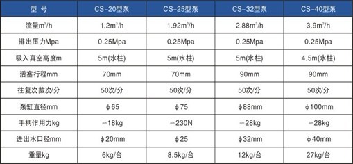 本公司生产的CS系列手摇泵中Y型和H型在结构和各部尺寸上均相同,其中H型的缸套采用铜材料,以适应海水和生活用水。