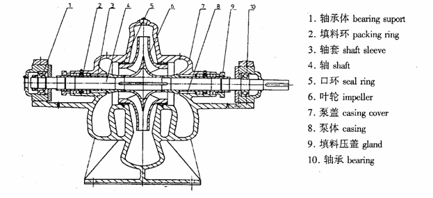 ﹒经过静平衡检验的叶轮,用轴套和两边的轴套螺母固定在轴上,其轴向位置可通过轴套螺母进行调整。叶轮的轴向力利用其叶片对称布置、两面进水达到平衡。